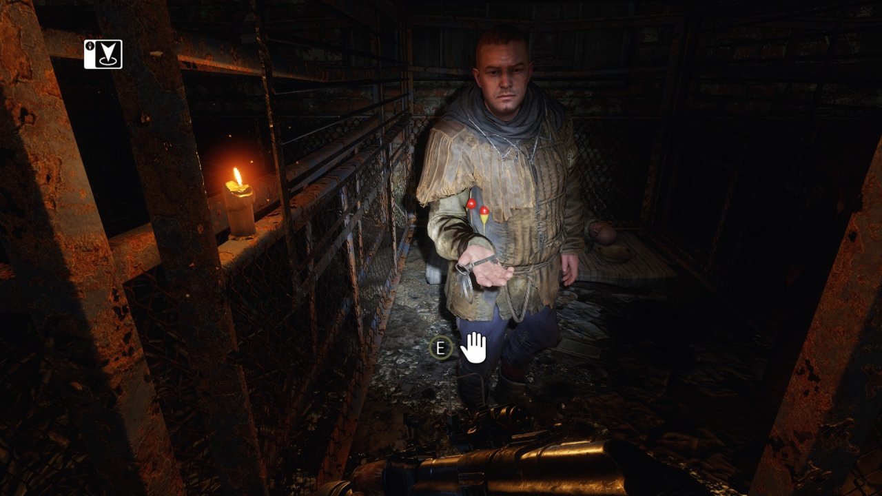與杜克相遇後,我們去往地圖左前方的問號處,此處有我們的道德點3,拯救村民,村民會給我們一把控制室的鑰匙,這也是杜克不死的必要條件。還是潛行不擊殺,注意有狗!不要被發現,還有我們的筆記和裝備!