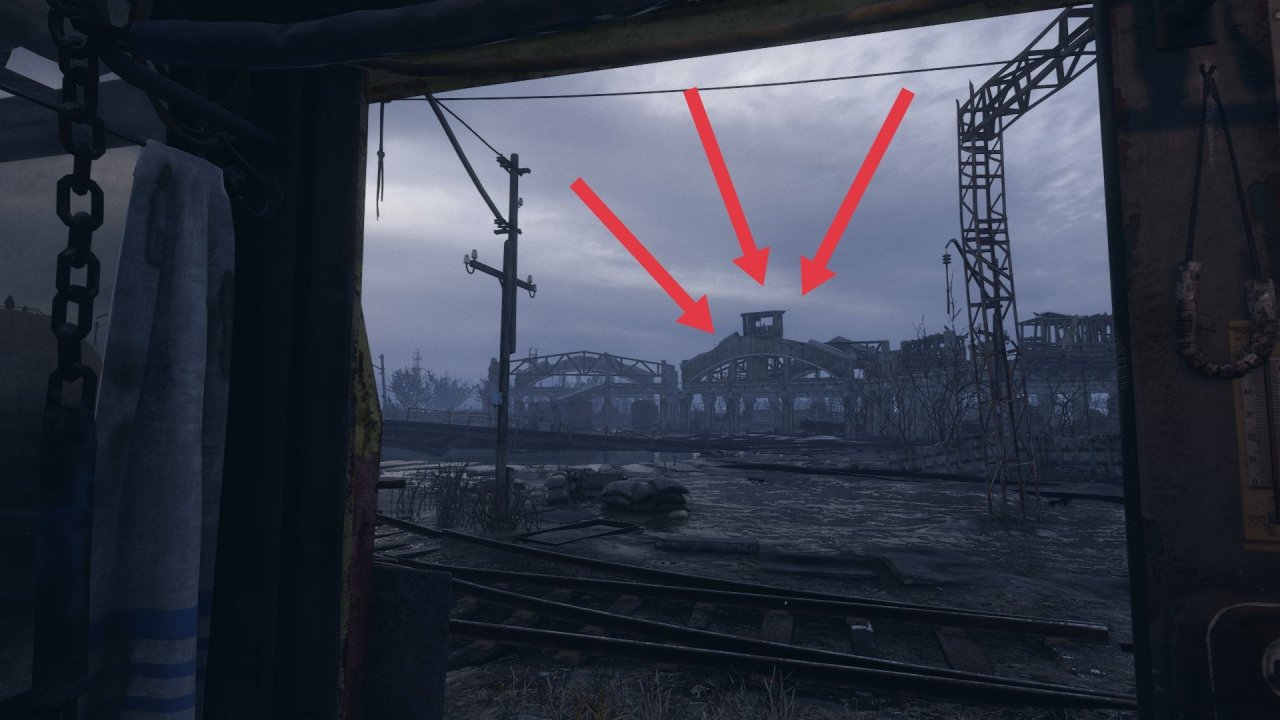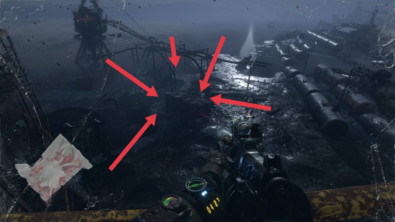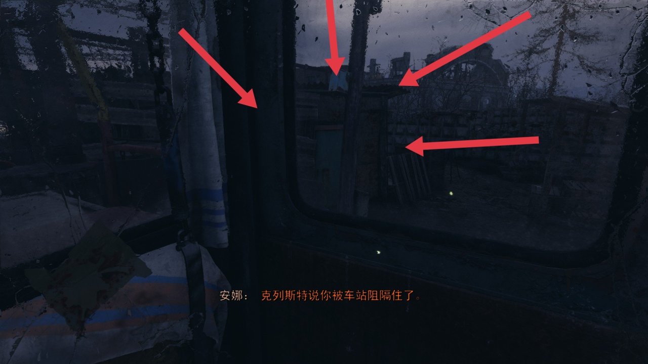 拿完小熊,我們往下看,去往剪頭所示的集裝箱那我們的筆記和裝備,然後再回到列車上!