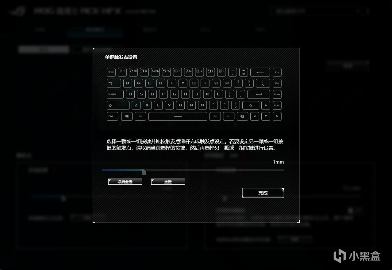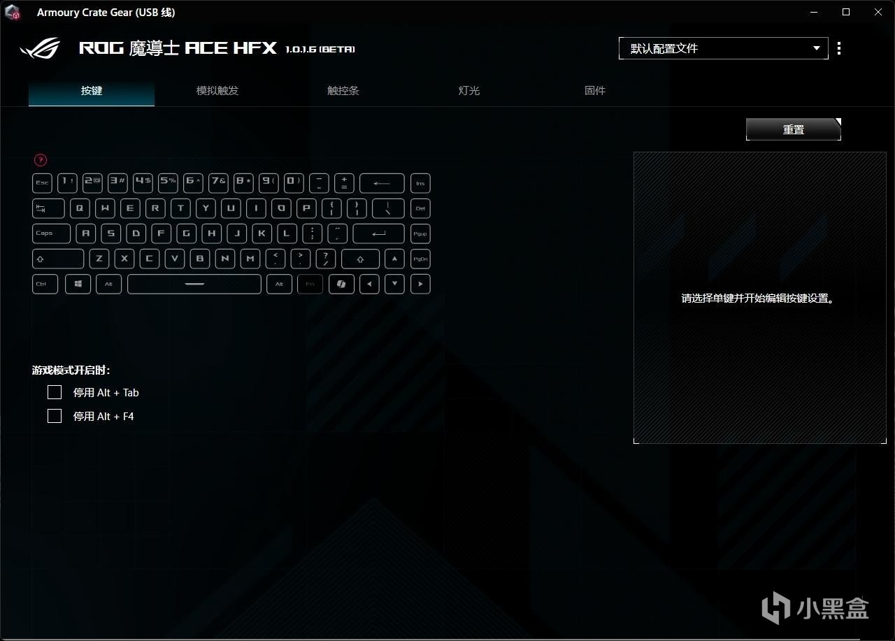 ROG HFX磁轴设计最大行程4.0mm,最小触发可以手动设置为0.1mm。初始压力40官方,触底压力位55gf。触发距离可以在奥创极速版自定义设置,整体可自定的地方还是非常多的。