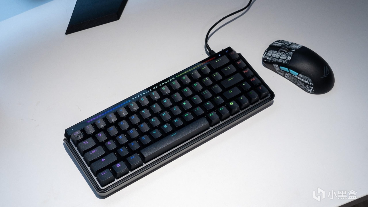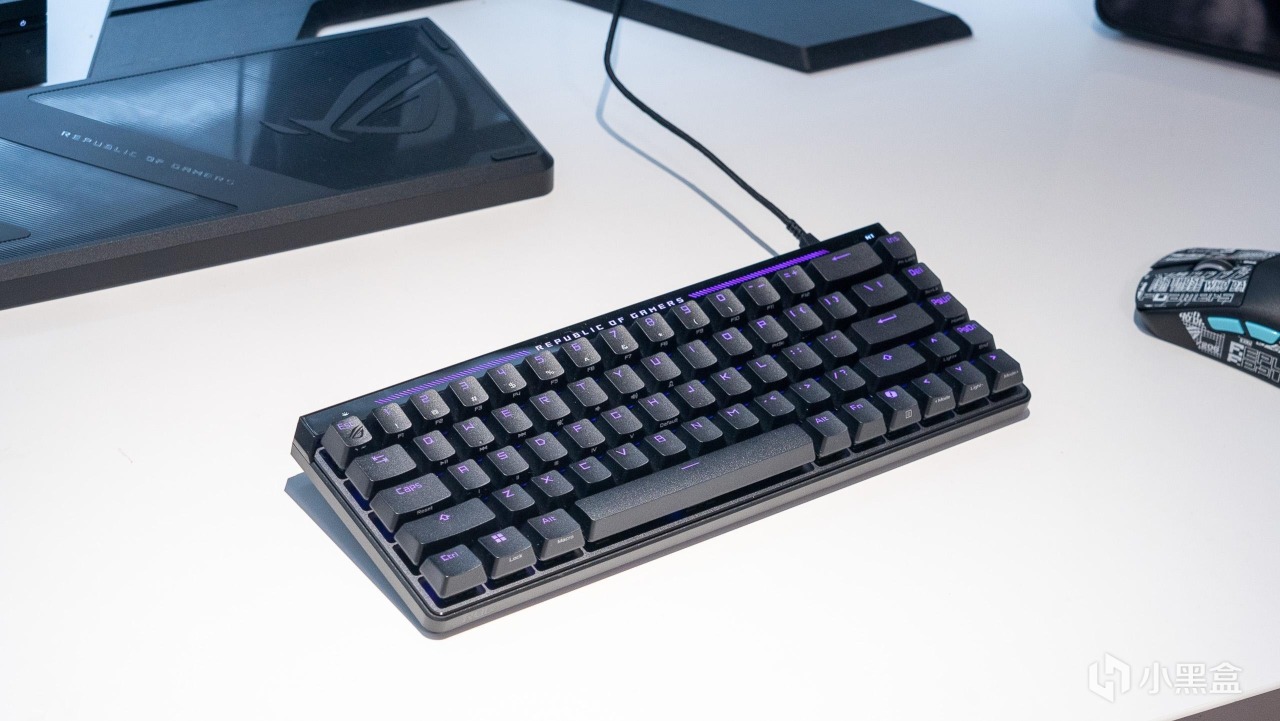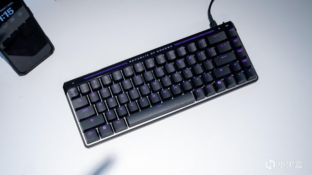 65%配列设计,标准的68键紧凑布局设计。键盘整体还是熟悉的魔导士外观,顶部是充满科技感的灯条设计,支持华硕的神光同步技术。