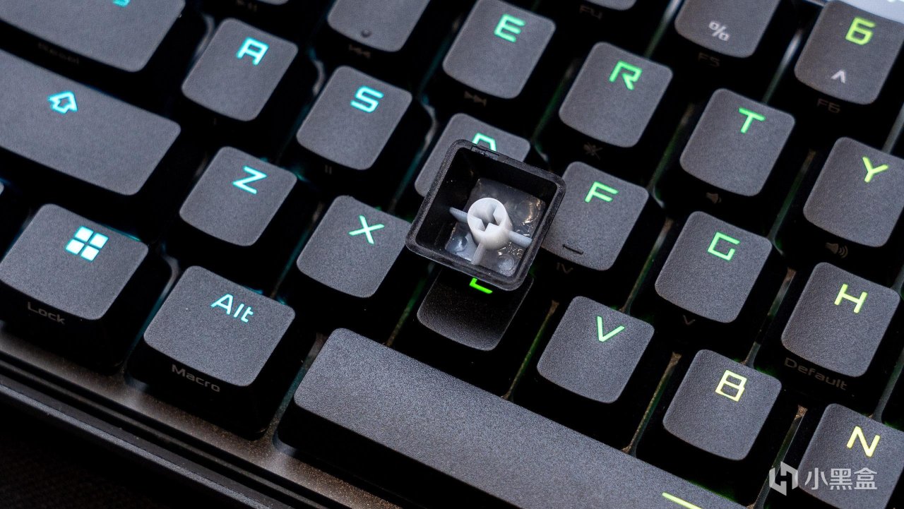 轴体方面全新的ROG HFX磁轴设计,作为华硕的第一款磁轴键盘来讲。华硕这款ROG 魔导士 ACE HFX磁轴调校还是不错的,当然这里主要指按键反馈、按键声音反馈以及游戏体验方面。拆下键帽看到这次的ROG HFX磁轴采用加强型十字轴设计,兼容各种十字轴键帽。