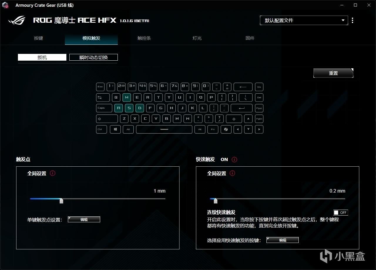 在模拟触发设置中可以设置板机的触发点与快速触发设置,有不同的调整策略。触发点的全局设置默认为1mm的触发点,而快速触发则可以通过RT键快速开启针对WASD键的设置,而且可以选择开启连续快速触发实现按下按键并首次超过触发点之后,整个键程都将有快速触发的功能。