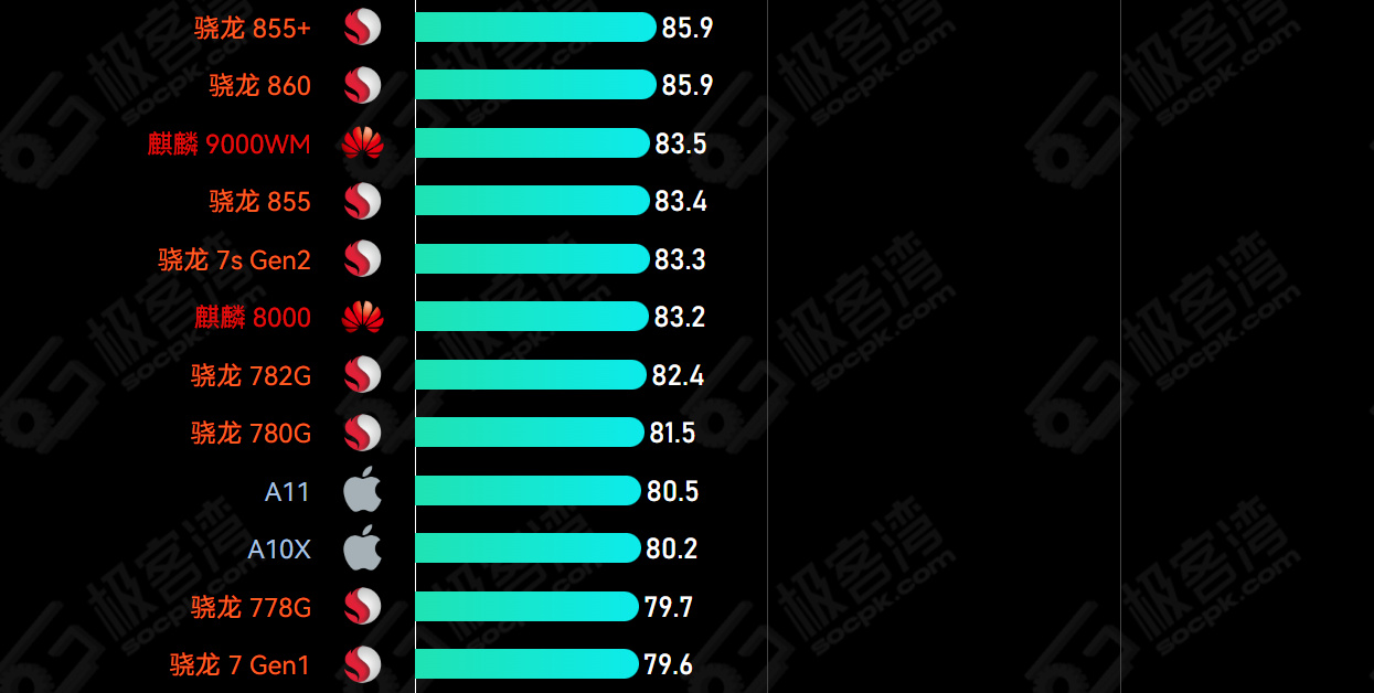 在極客灣的SOC天梯圖中,綜合性能得分跟靈動款的9000WM接近,麒麟8000採用ARM公版架構,不支持超線程。
