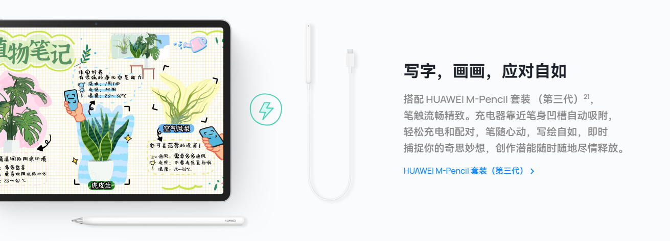 支持HUAWEI M-Pencil 3代,需要用充電器給筆充電。