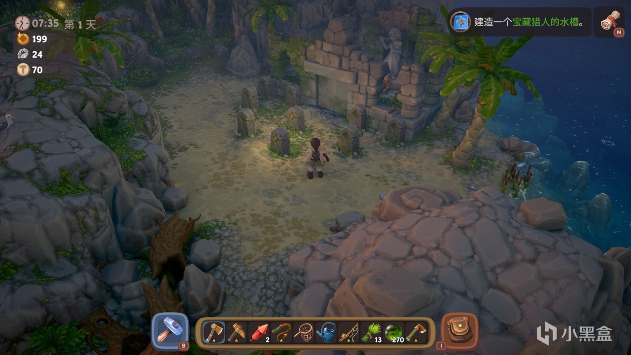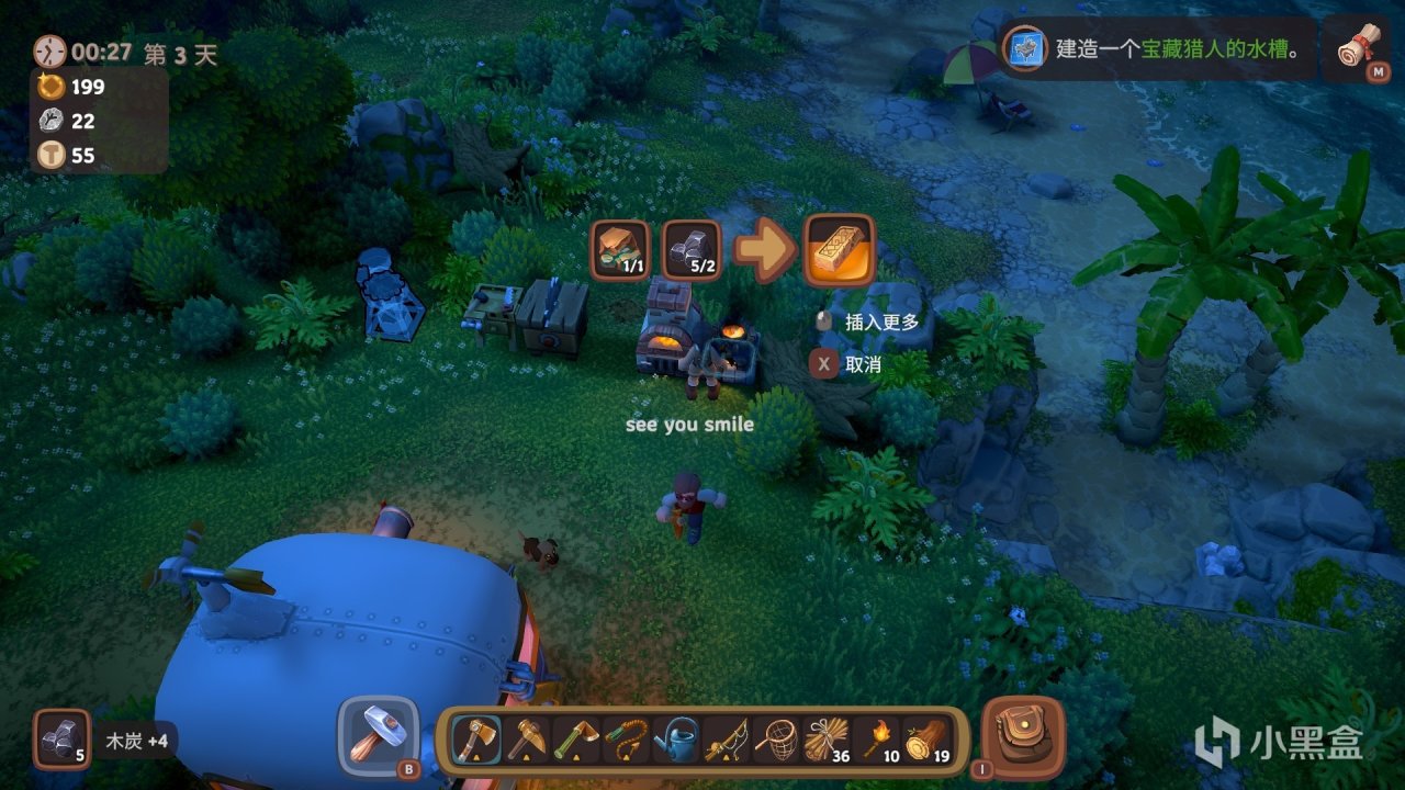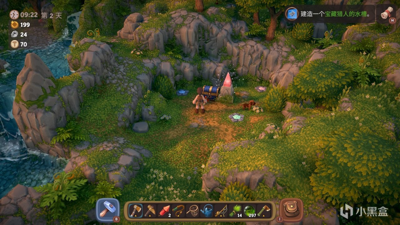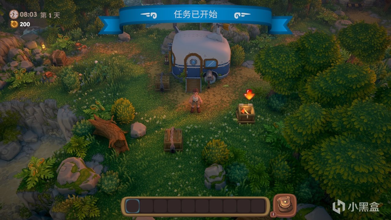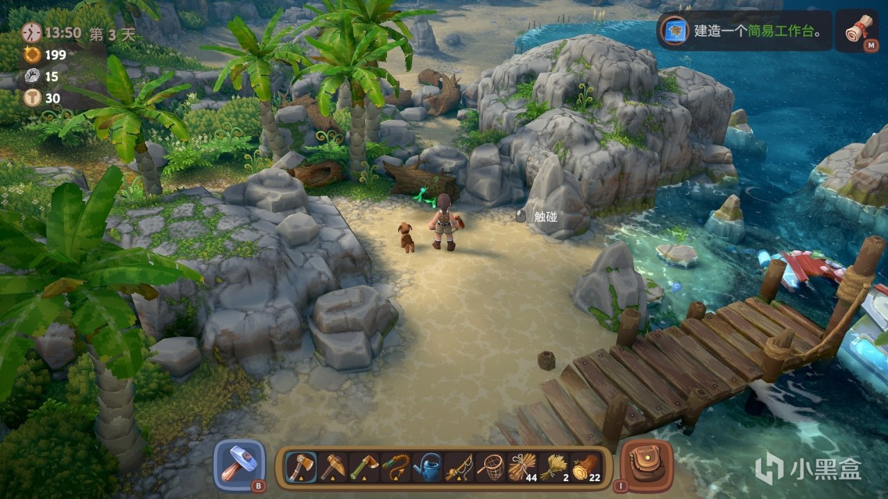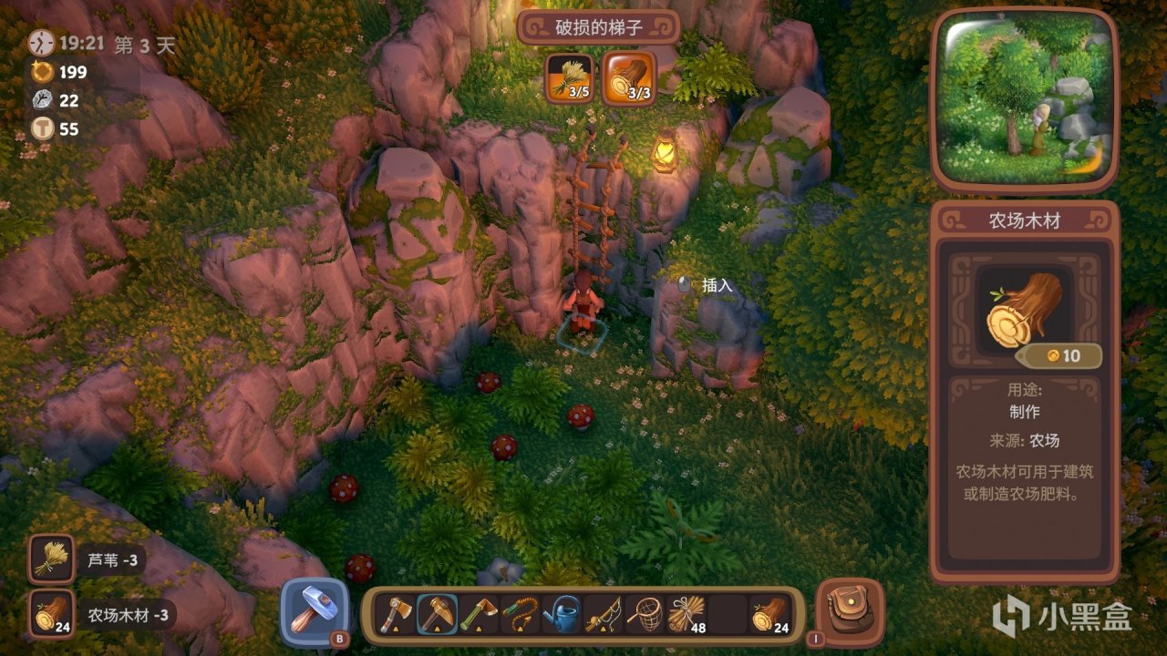 接下来就是经典的撸树撸石头环节了,前期一棵树要砍7次才能砍倒,石头也要好久才能挖开,再加上要用到素材的地方非常多,所以说还是挺肝的,这个也算是模拟类游戏常见的情况了,中期开始这个问题能通过升级采集工具得到缓解。