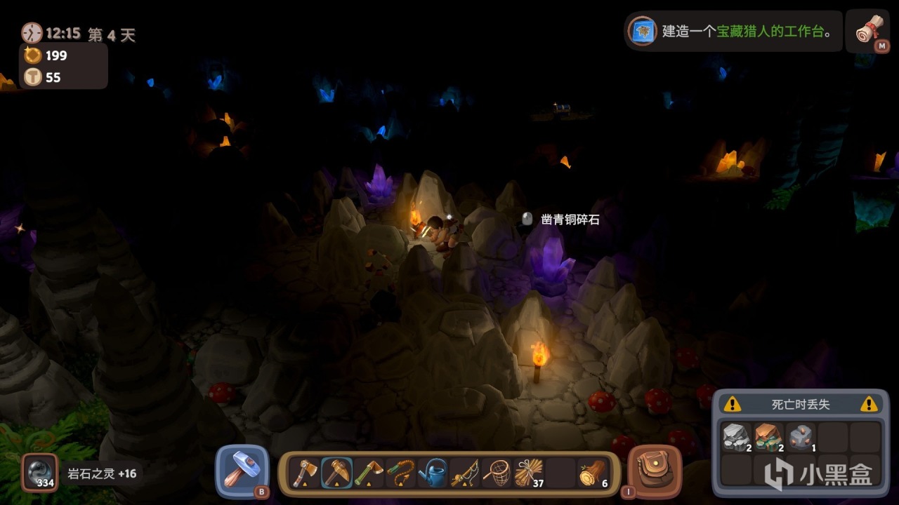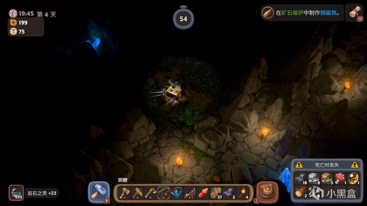 当玩家在此拿到第一个道具时便会发现不同寻常的地方,因为界面右下角出现了一个死亡时丢失的提示,没错,与收益成正比的则是矿洞里无处不在的危险。