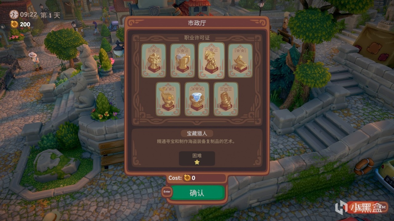 跟着指引来到市政厅,对话过后就可以选择职业了,本作提供了厨师、饮料师、宝藏猎人、铁匠、渔夫、珠宝工匠、考古学家等职业。