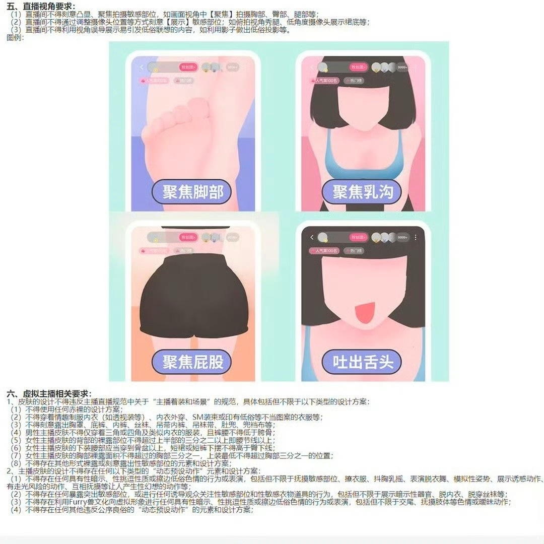“低俗擦邊”、“裸露穿着敏感”、“賣醜搞怪”等在內的多種違規行爲,並公佈了參考圖。