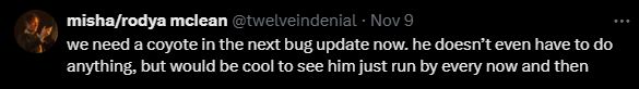 不过,Bug带来麻烦的同时也给玩家带来灵感和新的想象。“把Bug当Mod使”也是星露谷玩家习以为常的事情,比如鸡消失事件解决后,有人建议在游戏中加入真正的土狼,但是要不偷鸡只供收养的类型,保留为游戏的特色;而在多人模式下使用炸弹导致游戏崩溃的Bug,也可以被视作一种增添限制性的“极限挑战”。