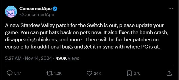 ConcernedApe接受批评并表示以后会减少补丁制作频率,提高制作效率