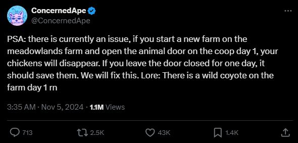在这之前,玩家在多人模式的Meadowlands农场养鸡时,如果在第一天忘记关闭鸡舍的门,次日早晨会发现小鸡全部消失。开发者ConcernedApe(本名Eric Barone)发推文解释,这是因为玩家没关好门,所以“小鸡被土狼偷走了”。