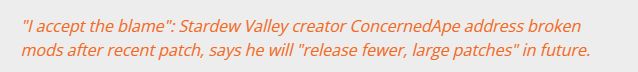 ConcernedApe更新补丁的频繁也给使用模组的玩家造成了一些困扰,玩家需要等待模组作者更新或者自己寻找兼容的模组版本,才能确保游戏和模组都能正常运行。针对这点,作者也非常善解人意地进行了回应。