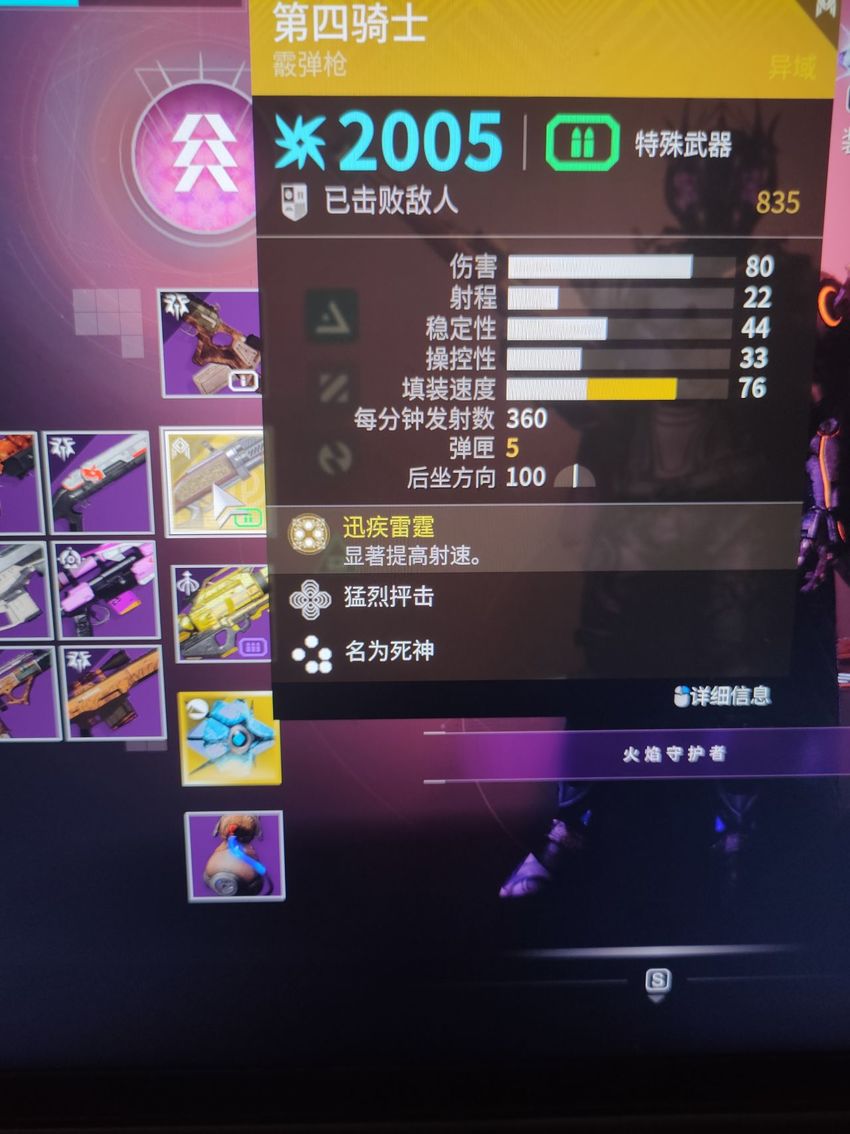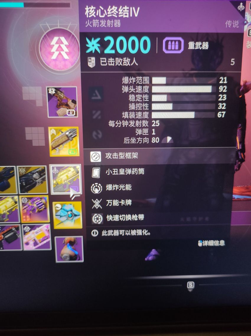 武器方面一號位根據場景需求帶一把處理勇士的白蛋即可,二號位第四騎士,三號位可以選一把傷害高的電屬性武器補傷害或者遠程輸出,我選擇了小丑皇爆炸光能的核心終結,不過這個賽季榴彈這麼強勢,可能perk合適的苦樂參半會效果更好。