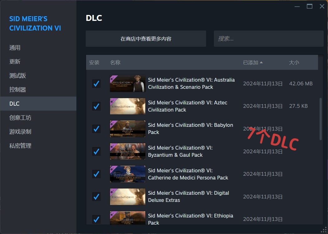 下面的是DLC,感覺買的應該是全DLC的吧(´;︵;`),一共27個,其中有個中文寫的“領袖季票”,不知道有什麼作用。