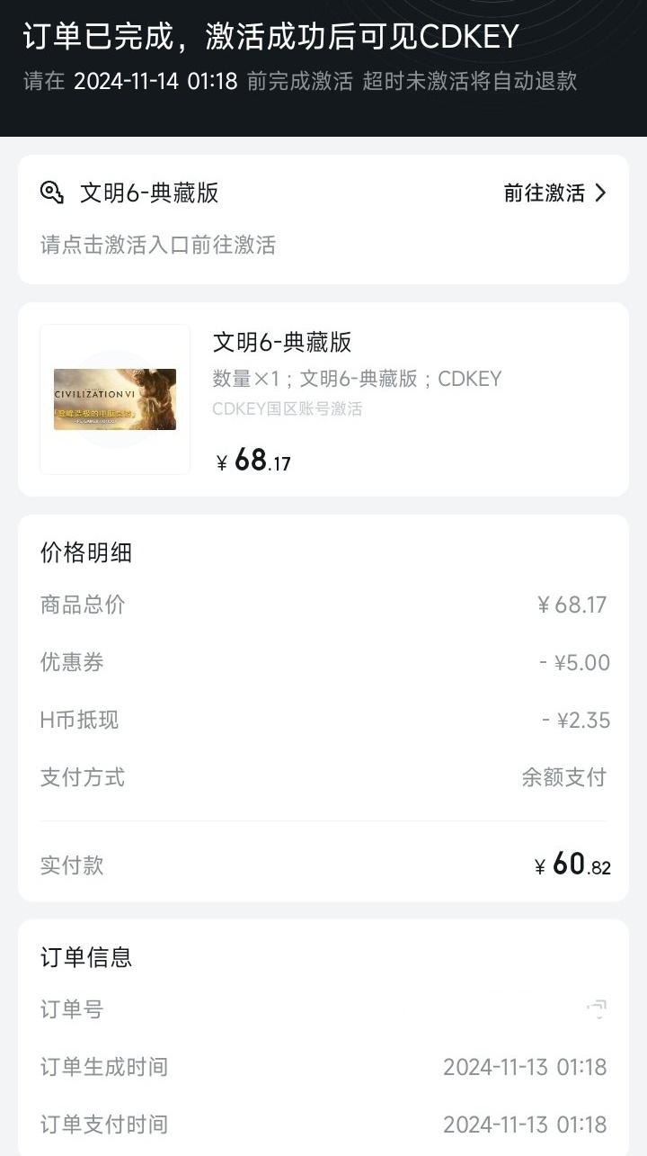 況且我這次還有小黑盒券減5塊,h幣減2.35元,還有餘額減25.32。最後我只需要花費35.5軟妹幣即可拿下文明6典藏版!