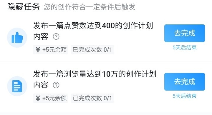 3.隱藏任務:這是在你發的帖子突然火了之後有幾率會觸發(幾率挺大的),比如流量超一萬,點贊超一百兩百之類的,都有幾率觸發。餘額給的2元到10元不等。