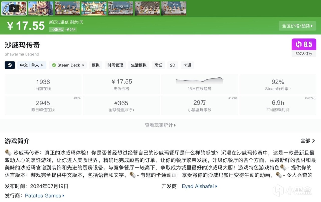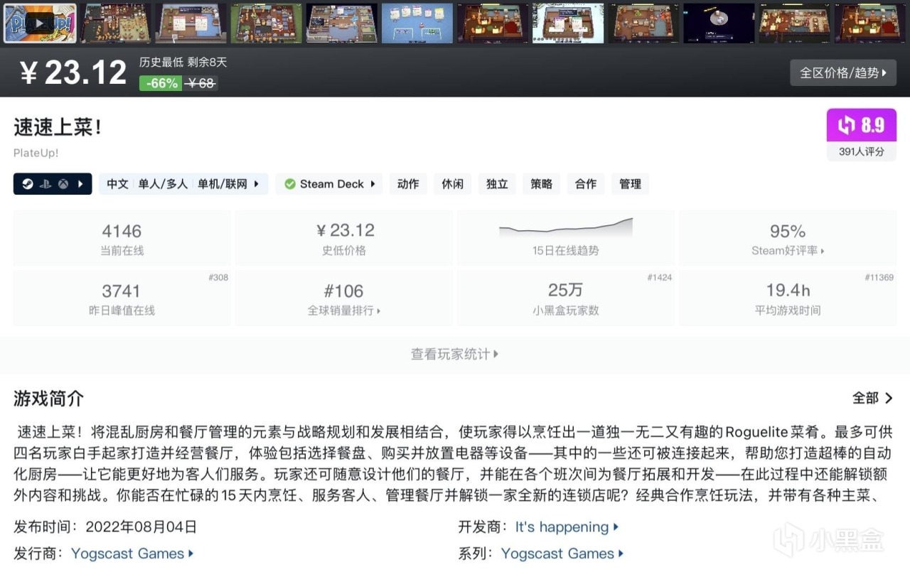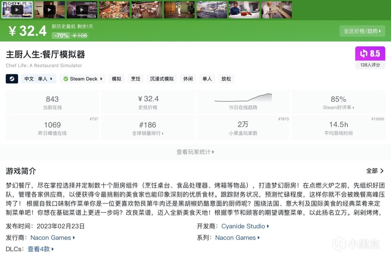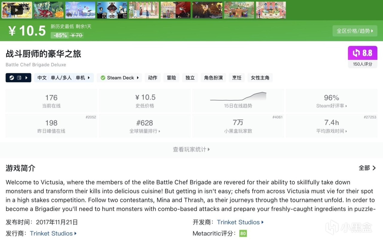 本篇並不都是烹飪類遊戲,大多數能夠查找到且處於史低期間的高分優質遊戲都會被收錄進來~