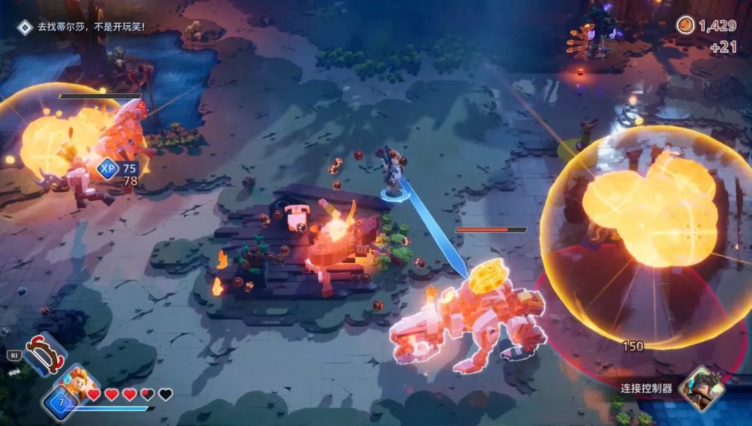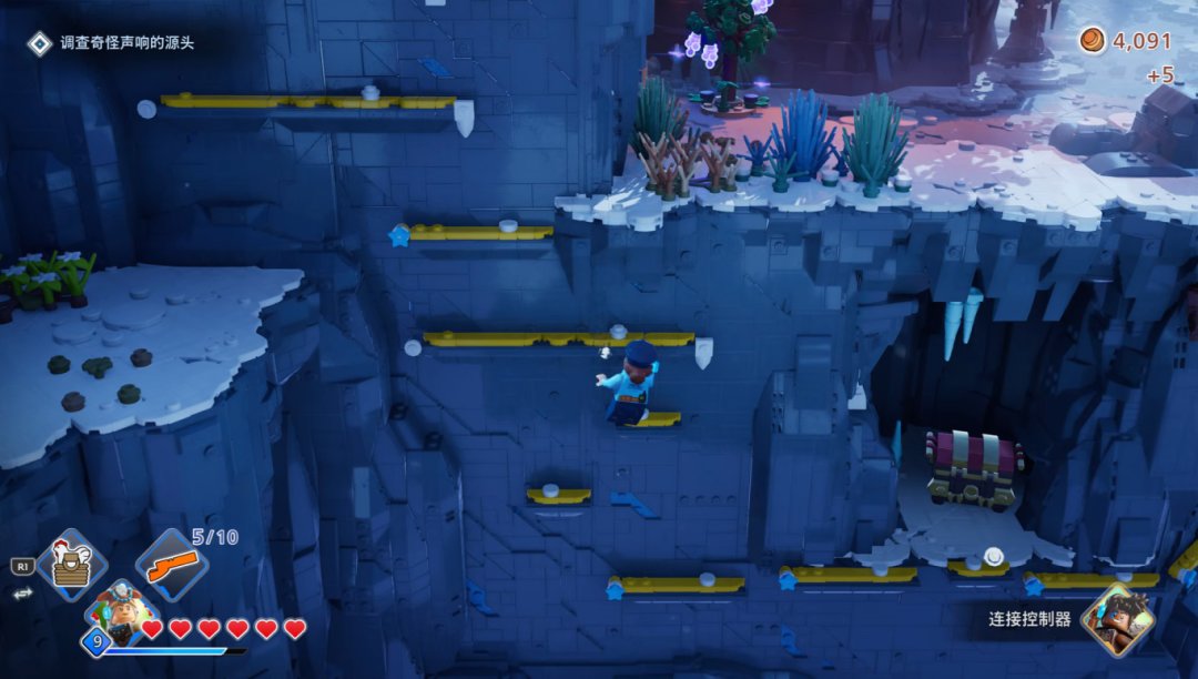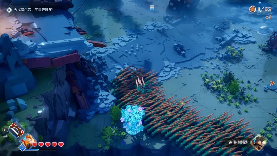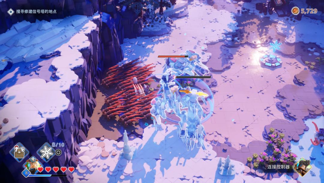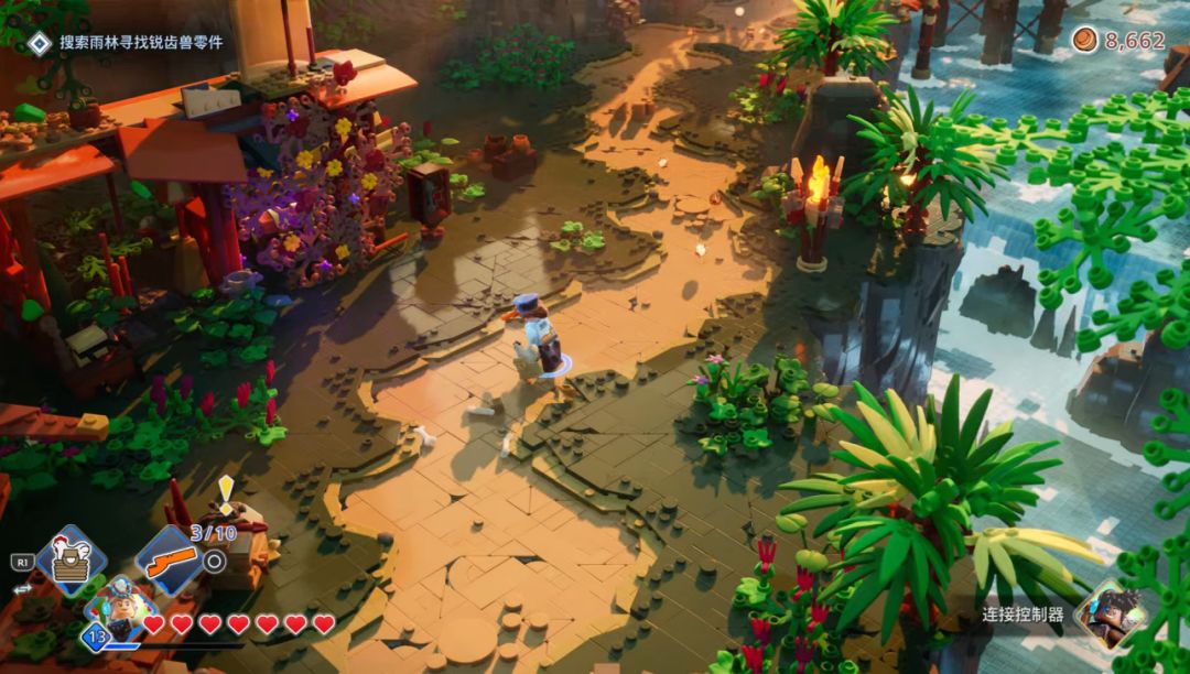 和原版地平线一样,乐高版也有元素攻击,火电冰三种伤害对应的DEBUFF就是灼烧、麻痹和冻结,这些元素攻击也能与地图内的场景进行互动,帮你开宝箱领奖励。游戏原创的特殊武器和道具都挺有意思的,比如说范围冻结的冰霜冲击波,还有能烧掉怪物汽缸的二段跳爆炸靴,都是能轻松战胜怪物群的存在,只是很多道具强度都比角色高,可能是对低强度角色的补偿手段。不过随着流程推进,敌人机制和角色能力也没什么新东西,面对成堆的怪物只能期待着手里的特殊道具,可能也是流程短的一个原因,开发团队没准自己也觉得做长了重复性太高,大伙会玩腻。
