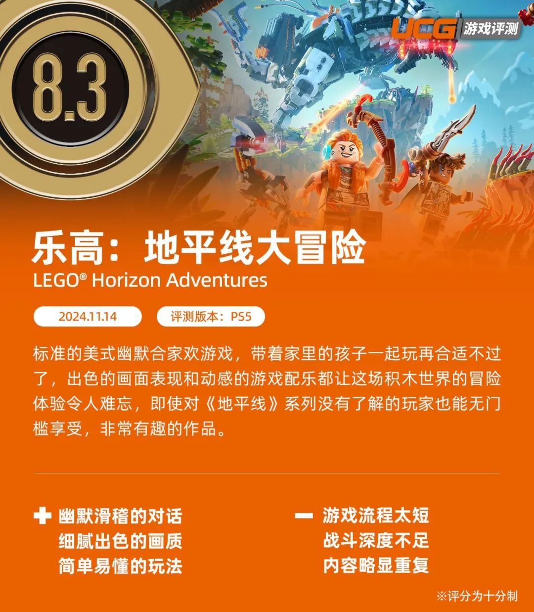 乐高地平线...等等,我说的不是在英国开跑车的那个地平线,对,我说的是这个,拿着弓箭射机器恐龙的地平线。初代的《地平线:零之曙光》在今年十一月初发布了重制版,趁着这波热度,Gobo工作室推出了《乐高®:地平线大冒险》。