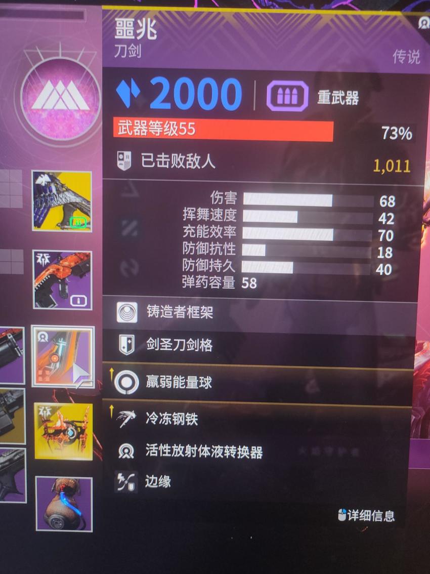 威能位我選擇噩兆刀劍,整套配裝看似沒有任何迴轉,然而威能位的惡兆確保了兩記充能重攻擊即可完成超凡暗影條的回覆,虛空渦流手雷以及電弧近戰光明飛蛾使光能超凡條可以回覆。使得你最快速度進入超凡後,用光明飛蛾和堡壘在怪海中盡情游龍!噩兆的羸弱能量球產出的球可以觸發火大結合使命琢面贈送的一層恢復,使你在游龍的時候進一步增加存活能力。