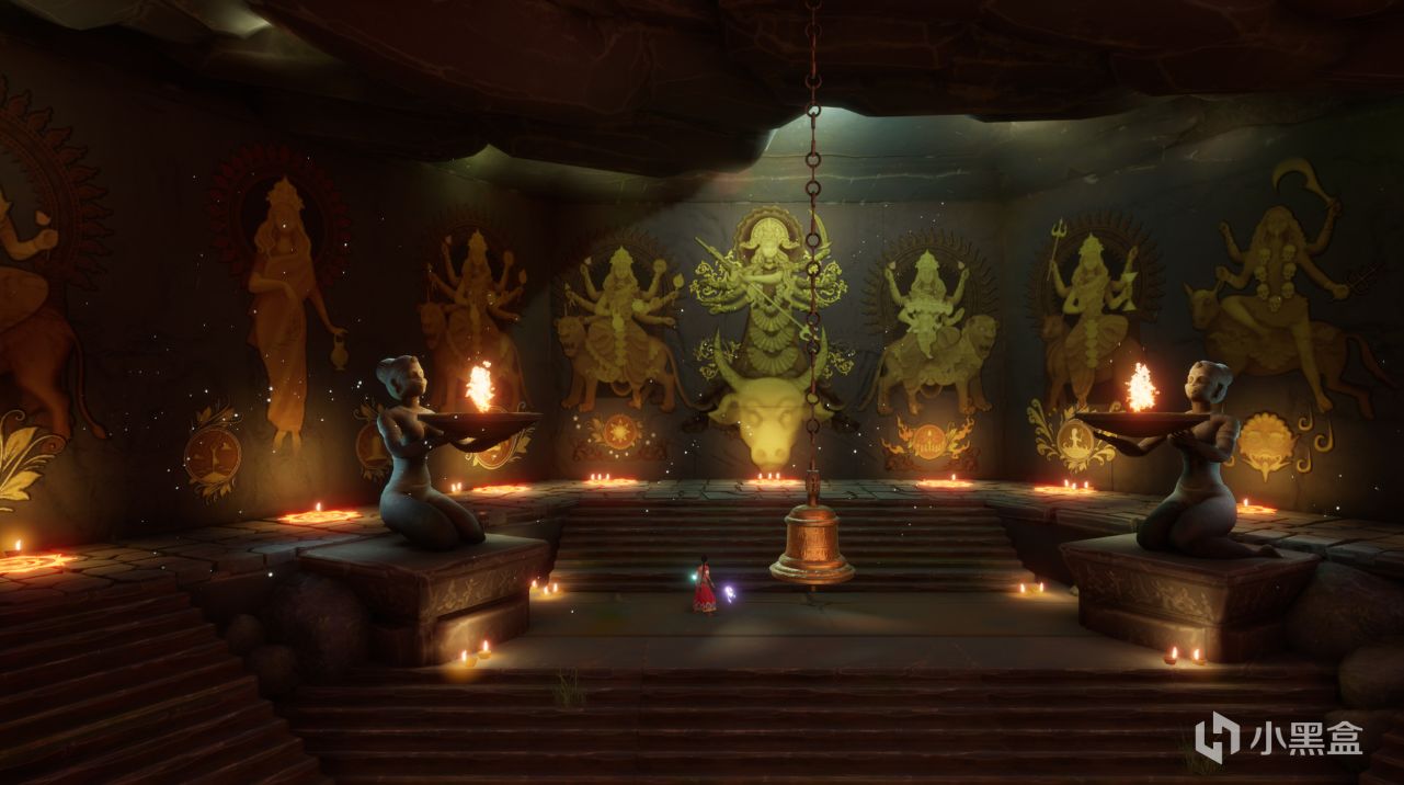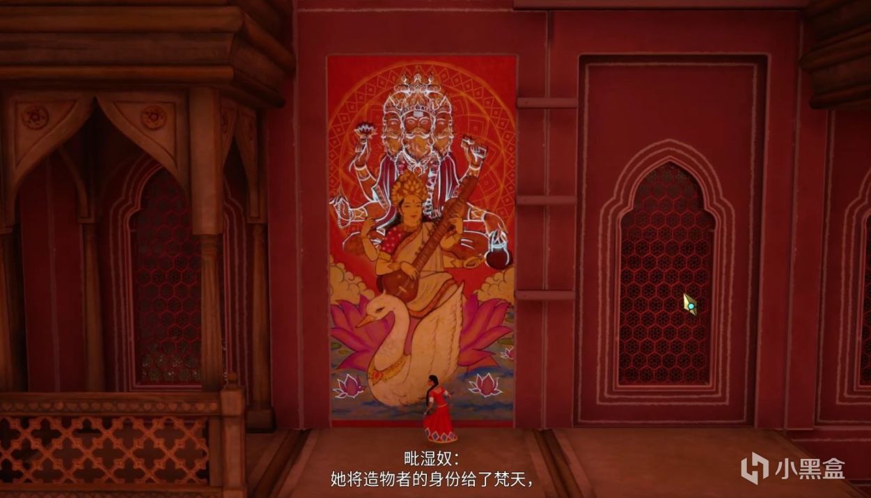 而壁画更是游戏中的一大亮点,玩家站在壁画前与之互动,便能听到旁白讲述画上的故事,了解一些印度神明们的故事。