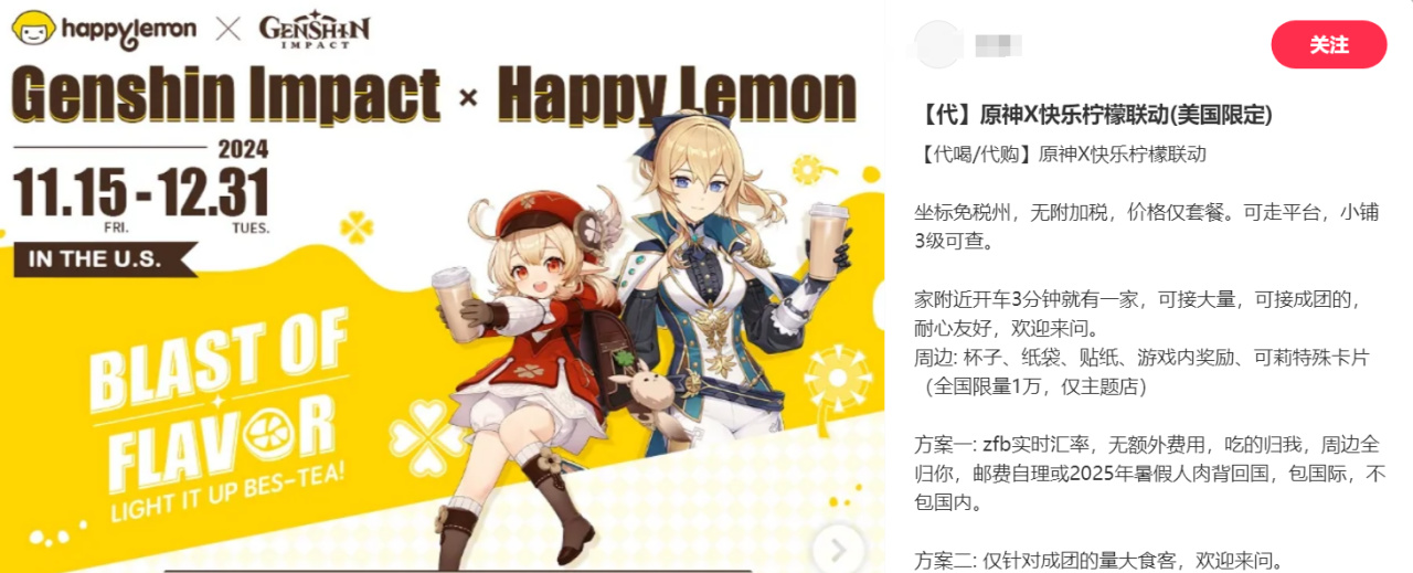 于是代吃开始兴起,附近没有联动店铺的小伙伴,就会拜托远方的朋友,或是网上方便的人,帮忙代吃获取联动周边。但没想到的是,如今代吃居然已经发展成了跨国业务,11月15日,《原神》在美国地区与快乐柠檬茶饮店开启了联动,经常被外国友人羡慕的国内玩家,这次也风水轮流转,成了羡慕的一方,而网上也出现了跨国代吃的广告。