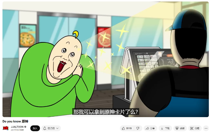 具体到活动设计上也会迎合当地文化,比如在电竞氛围浓厚的韩国,与alvolo披萨的联动活动,就邀请了俗称“原神哥”的冠军电竞选手BeryL来拍摄视频广告,收获了玩家的热烈反响。油管近300万粉丝的韩国动画制作人JJALTOON还制作了一期动画,来讲自己参加联动遇到的搞笑故事。