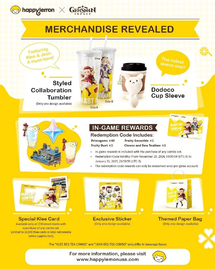 本次《原神》联动快乐柠檬活动推出了两款主题饮品,赠品周边包括两种主题杯,嘟嘟可杯套,卡片、贴纸、主题纸袋,还有游戏内的虚拟奖励。线下部分店铺和餐车被装饰成了《原神》主题样式,现场还会有coser出席。