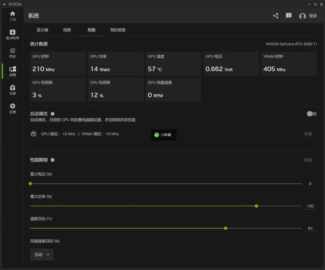 性能标签页包括了显卡状态监控及GPU优化功能,用户可通过「自动调优」一键优化,也可以手动在「性能限制」模块中调节。