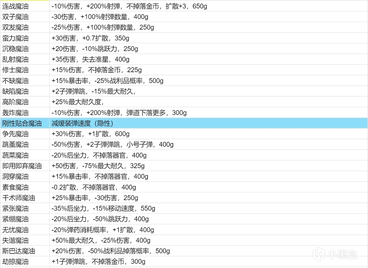 一般比較容易接受的是:不再掉落金幣、彈道下落更多(1次)、減傷、額外彈藥消耗(後期不缺子彈的情況)等。具體可參考我的在線文檔,目前已完整記錄96種魔油屬性。