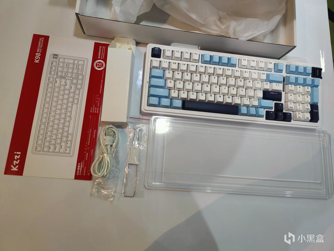 珂芝K98的附件算是比较丰富,键盘1个、说明书1本、 数据线1条、 拔键器1个、保护罩1个、2.4G适配器1个,不过没有备用的键帽和轴体。
