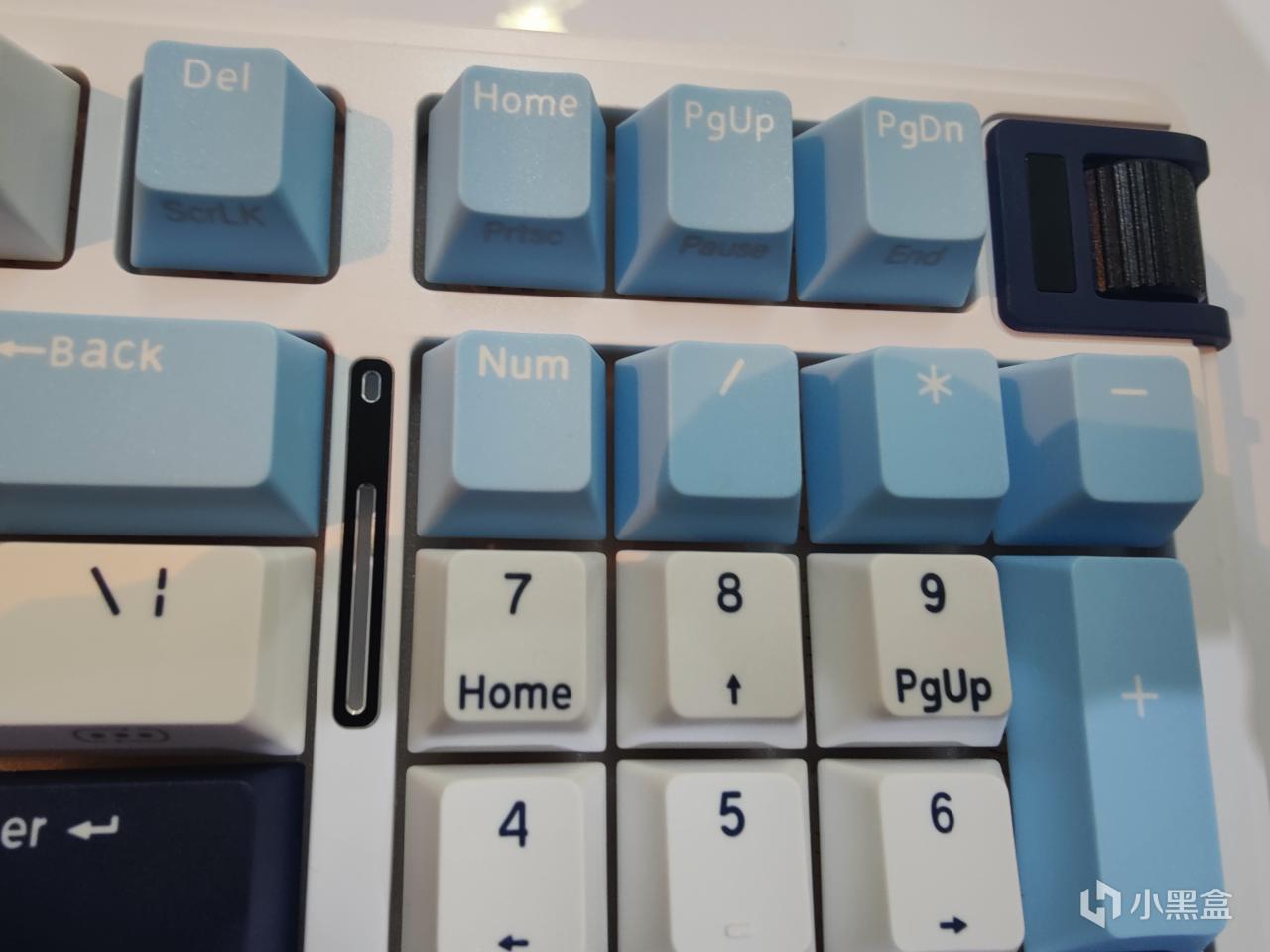 这个键盘的右上角有一个铝合金的三模滚轮,不仅能准确地在线连接、蓝牙连接、2.4G连接三种模式里进行切换,还能快速地调节音量,很是方便。