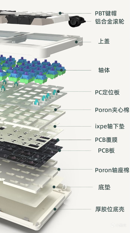 珂芝K98采用了经典的Gasket 结构,由中板Poron棉、IXPE轴下垫、PCB覆膜、底部消音棉、PET声优垫组合在一起的五层填充,提供了非常好的消音效果,基本杜绝了机械噪音。我的个人体验,就是感觉这个键盘的声音非常清脆,悦耳动听。另外,键盘的手感非常舒适,不管是打游戏还是打字办公,基本都游刃有余。