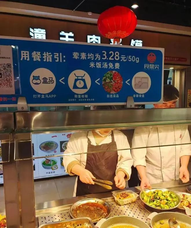 物美超市、盒馬生鮮、永輝超市等商超也投入餐飲業,推出平價快餐。