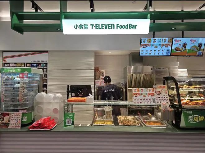 據紅餐網報道,今年4月,7-Eleven在廣州珠江新城星匯國際大廈開設一家小食堂,專門開闢出一塊堂食區,售賣現制、現烤、現炸的食品,售價從6.9元—22.9元不等。