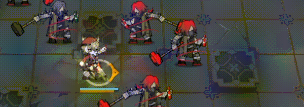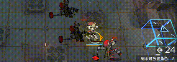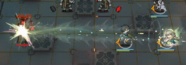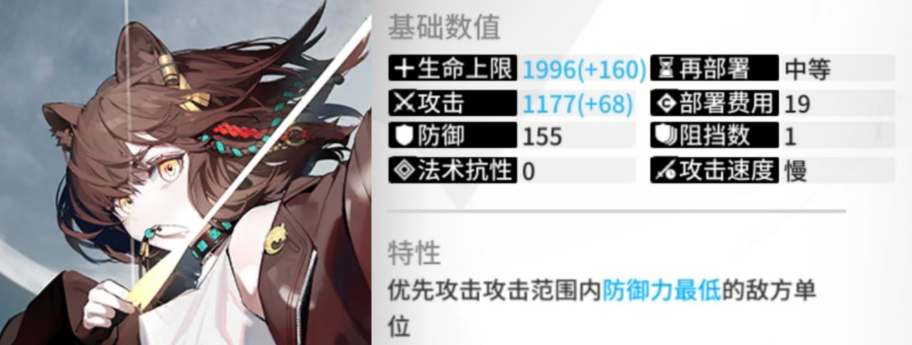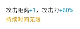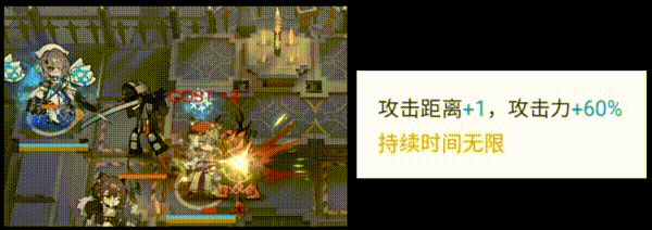 ①技能增加1格,和教官近卫的常态攻击范围一致,攻击力提升至861×1.6≈1378,正好天赋也和教官的特性很相似,带①技能模仿教官,1秒攻速略快于教官1.05秒攻速