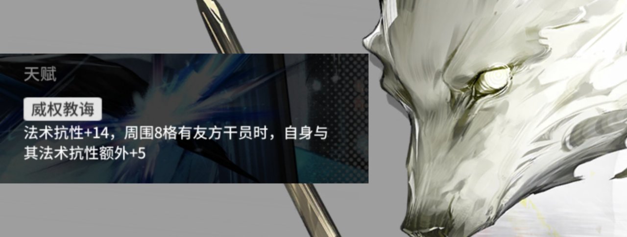 天赋使其周围8格存在其他干员时,深律和这些干员的法抗额外+5,深律最多29法抗,周围8格的召唤物不算,深律模组在五星干员当中是很值得开的,加强自身和队友