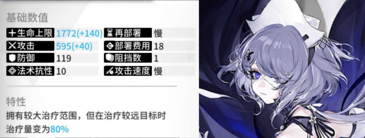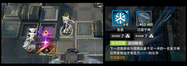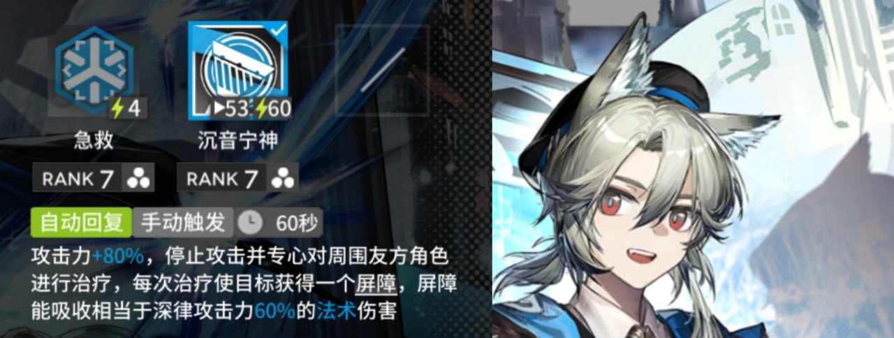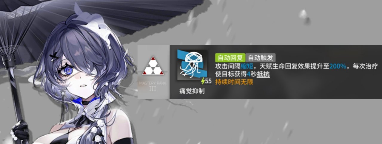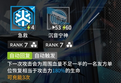 ①技能是急救就已经很优秀了,和临光①、塞雷娅①、黍①的效果一致,由于深律获得的不是提升15%治疗量的x模,奶量555×1.8=999低于临光①,不过挂机依旧方便好用