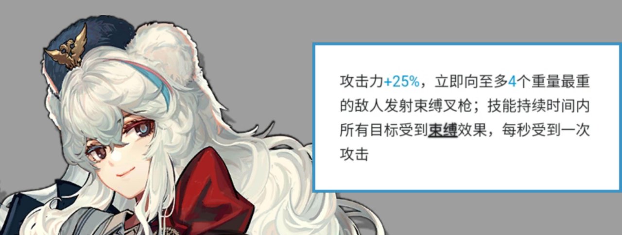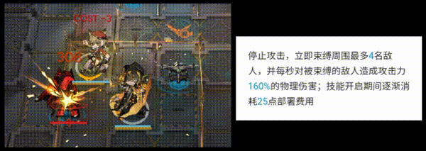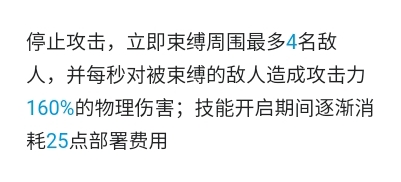 裁度这个②技能和早露③技能具有非常相似的设计,都是对4个敌人束缚8秒并造成每秒物伤,早露③期间攻击力+25%也相当低,裁度②可以说是行商版雪崩击了