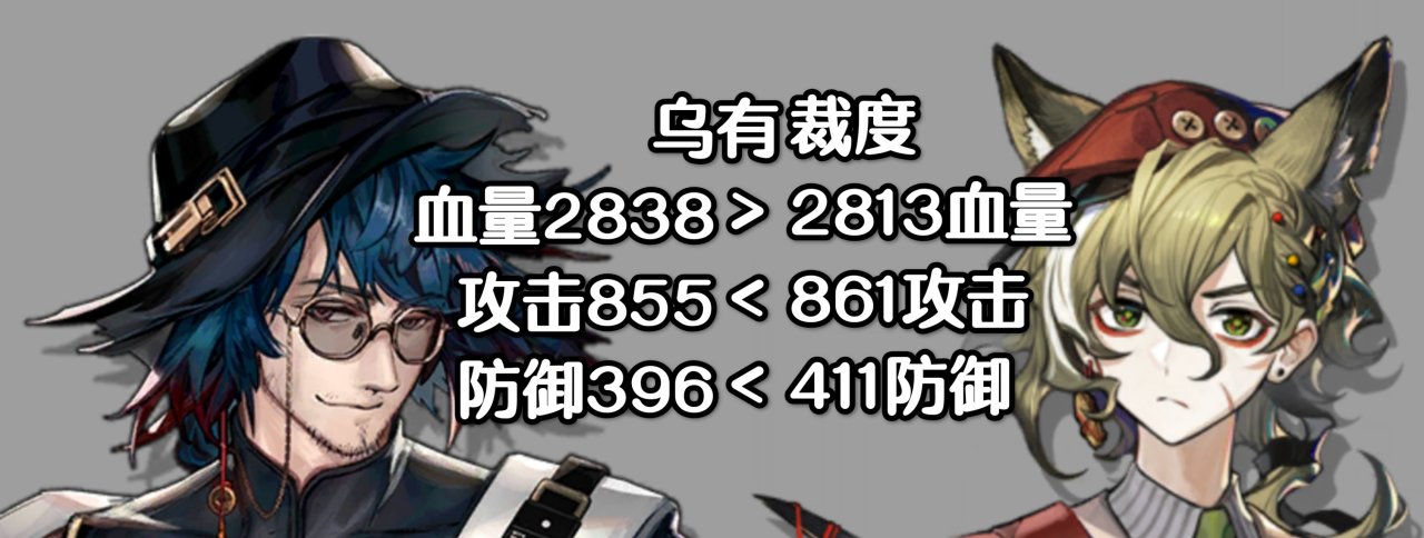 裁度满潜6费,大多数博士应该都满潜了,满潜再部署时间22秒,有攻击潜、天赋潜,面板对比同星级且同为限定池五星的乌有,裁度的防御、攻击略高,血量则略低,相差不多