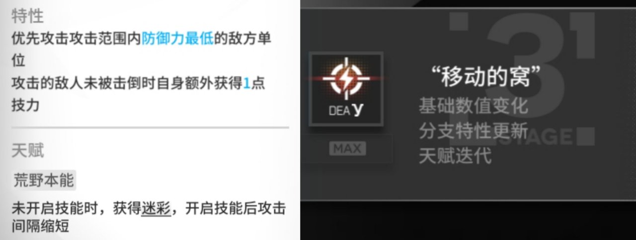 子月的天赋含金量较高,非技能期间迷彩,不开技能的情况下非常安全,稳定站场,技能开启后缩短攻击间隔,提高出伤速度,携带3级y模后技能期间攻速提升至2.025秒