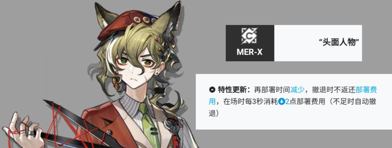 行商的优势是类似处决者、情报官的较短再部署时间,同时费低、技能回转快,技能多以永续技为主,能插拔也能站场,裁度x模特性每3秒扣3费改为扣2费,缓解费用压力