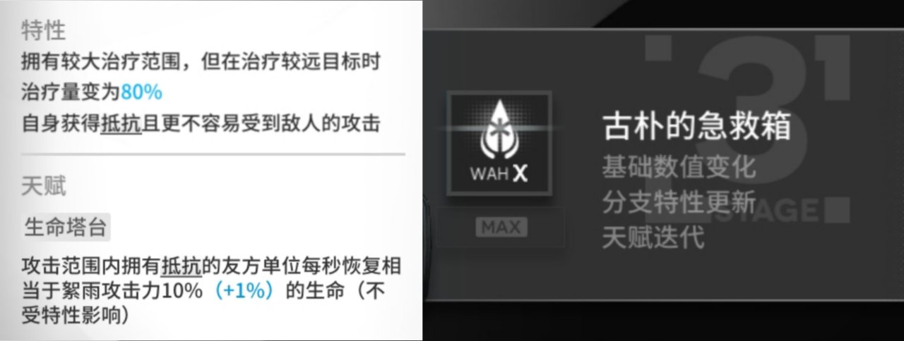 天赋补救了外围治疗量衰减的缺陷,絮雨天赋很强,范围内拥有抵抗的友军每秒回血≈60,绝食干员、召唤物来者不拒,x模特性使絮雨自身拥有抵抗,常态自回血