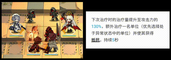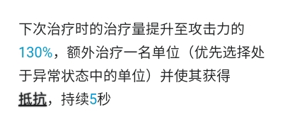 絮雨①技能不太常用,和华法琳①一样都是攻回挂机,触发时治疗量提升至595×1.3≈774,奶2并各自施加5秒抵抗,虽然专三仅2技力,但感觉改成自回5技力会好得多