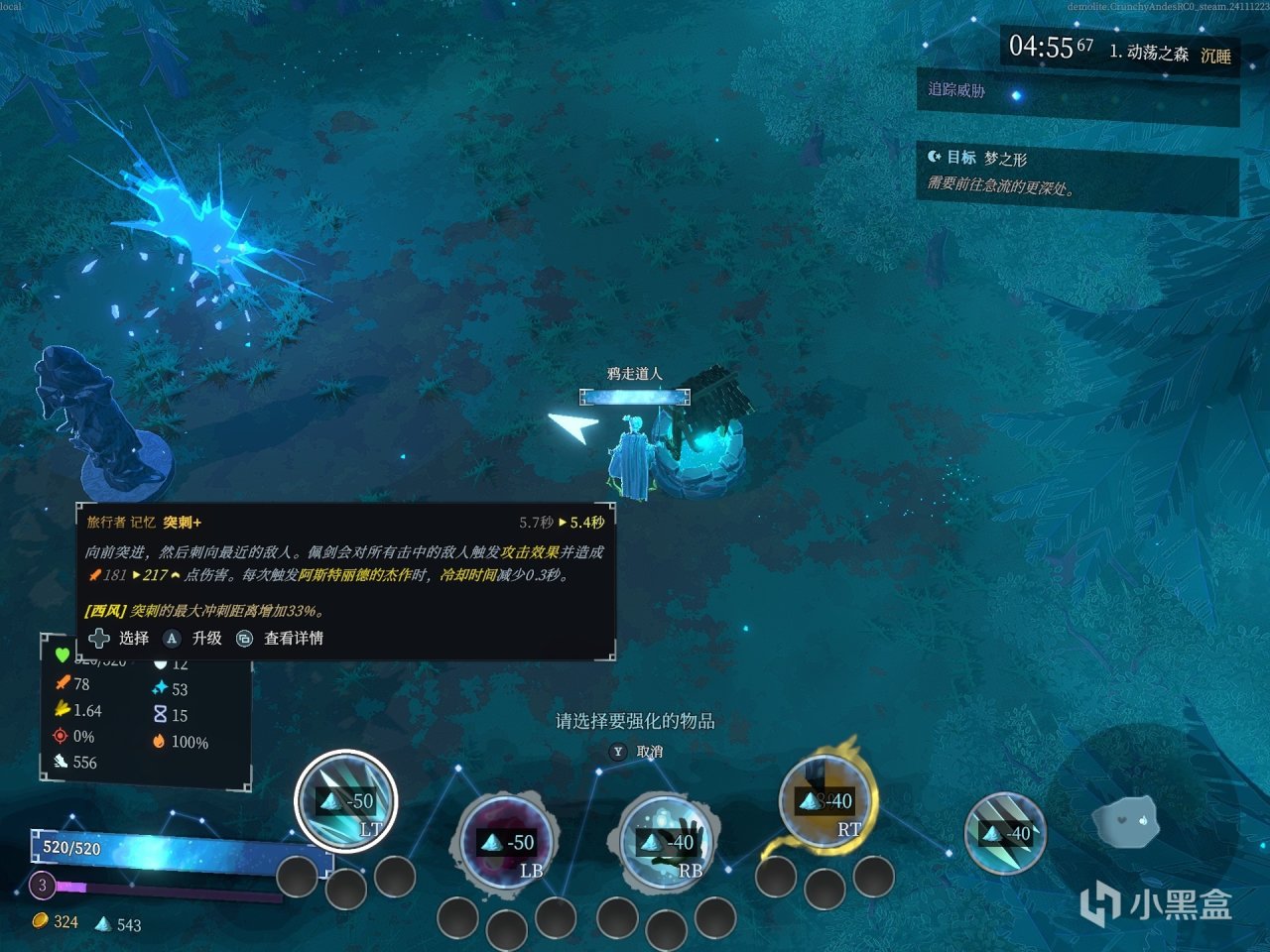 在游戏之中我们起始的时候会获得一个角色专属的被动技能以及一个主动技能,主动技能可以在后面获得其他技能的时候进行替换,并且最多可以拥有四个不同的技能。而技能在我们选择拥有水井的地图之中利用蓝色晶体进行强化,这一点来说目前不清楚最多能够强化多少次,我强化次数最多的时候是十几次,但是仍然不是上限(我觉得并没有设置上限,而是单纯的数值进行叠加)