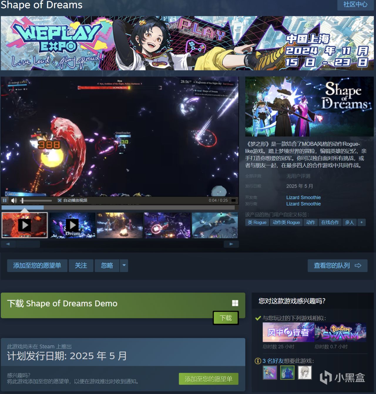 这款《Shape of Dream》以目前的Demo试玩来说,质量算是在及格线之上大概7/10左右吧,目前的基底玩法上面来说玩法深度也是有的,技能加上三个不同方向的技能石镶嵌,不同角色的技能树加点,后续再扩充对应的池子相信还是挺不错的(但是优化需要再好点)