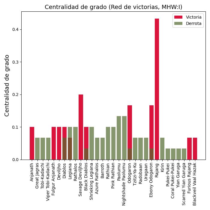 最後,圖七是《怪物獵人世界》的中心性(degree centrality),指的是某個怪物與其他怪物的連接數量與總怪物數量的比例,紅色代表勝利,綠色代表失敗。從該圖來看,金獅子無疑是怪物生態系統中的王者。