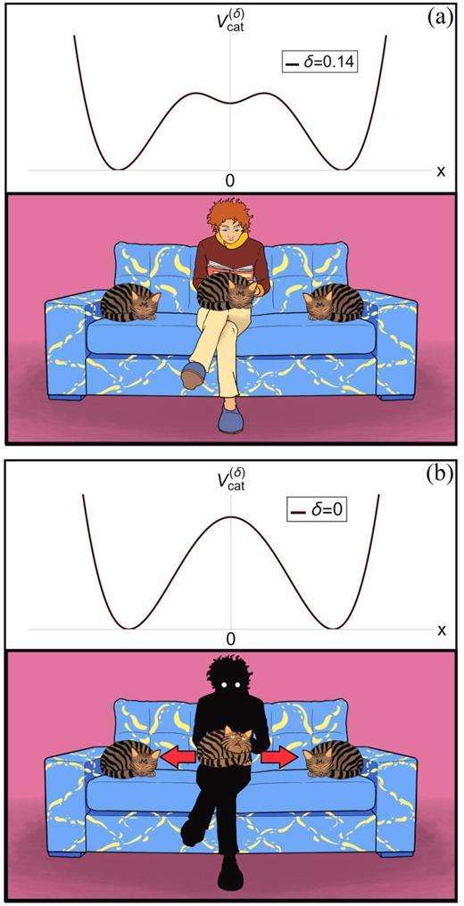 方程中,g>0是耦合常數,δ在[0,1]區間,反映了貓對人的依戀。,當δ=0 時,點x=0(人的位置)是不穩定的,即貓對人沒有依戀。當δ>0時, 點x=0是穩定的。並且δ值越大,貓的依戀越強。當δ=1時,這表明貓對人有很強的依戀。如下圖所示,圖1是貓依附在人身上,圖b則是人對貓來說完全是陌生人(黑影)。這兩種情況貓都處於靜止狀態,處於三個平衡點。
