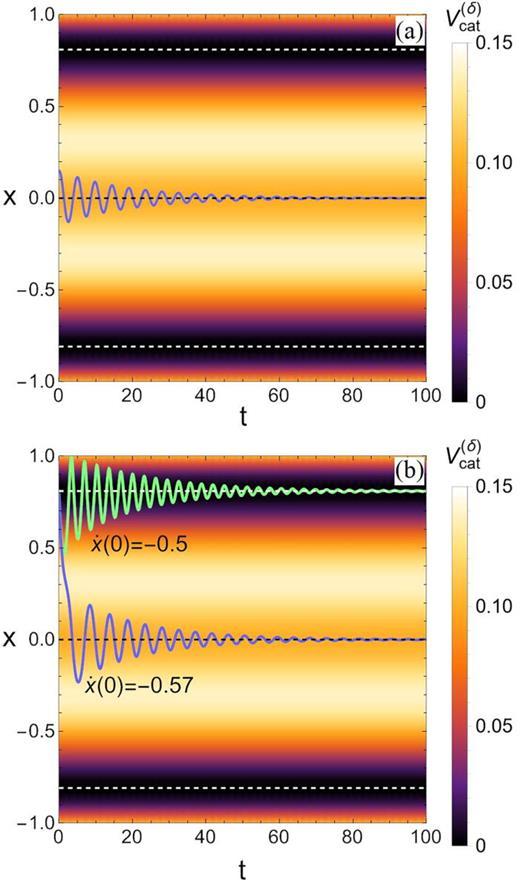 即,“當貓被人撫摸時,它們會以振盪運動來回移動。” 這種效應也在x=0附近的穩定區域重現(對於δ>0的情況)。