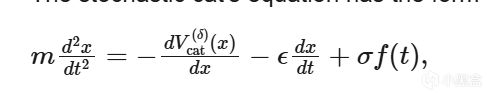 文章提到,貓會感受到一種與外部勢能(由人的存在所引發)相關的“力”,其中 x(t)∈R 表示在時間 t 時貓相對於位於 x = 0 處的人的位置。因此,m>0 是貓的質量,ϵ>0 是考慮貓疲勞的摩擦係數。其結果就是下面這個方程: